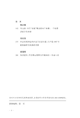 论 文 郁喆隽 142 马克斯·韦伯“祛魅”概念的两个来源:一个思想 谱系学的考察 周忠贤 173 社会系统理论的社会学启蒙方案:以卢曼 1967 年 就职演讲为线索的考察 连逸晗 205 知识错位:医疗跨层级整合中的组织—专业互动 本刊不以任何形式收取版面费,全国社科工作办举报电话:010-63098272。 执期编辑: 张 军 ·ⅱ·
